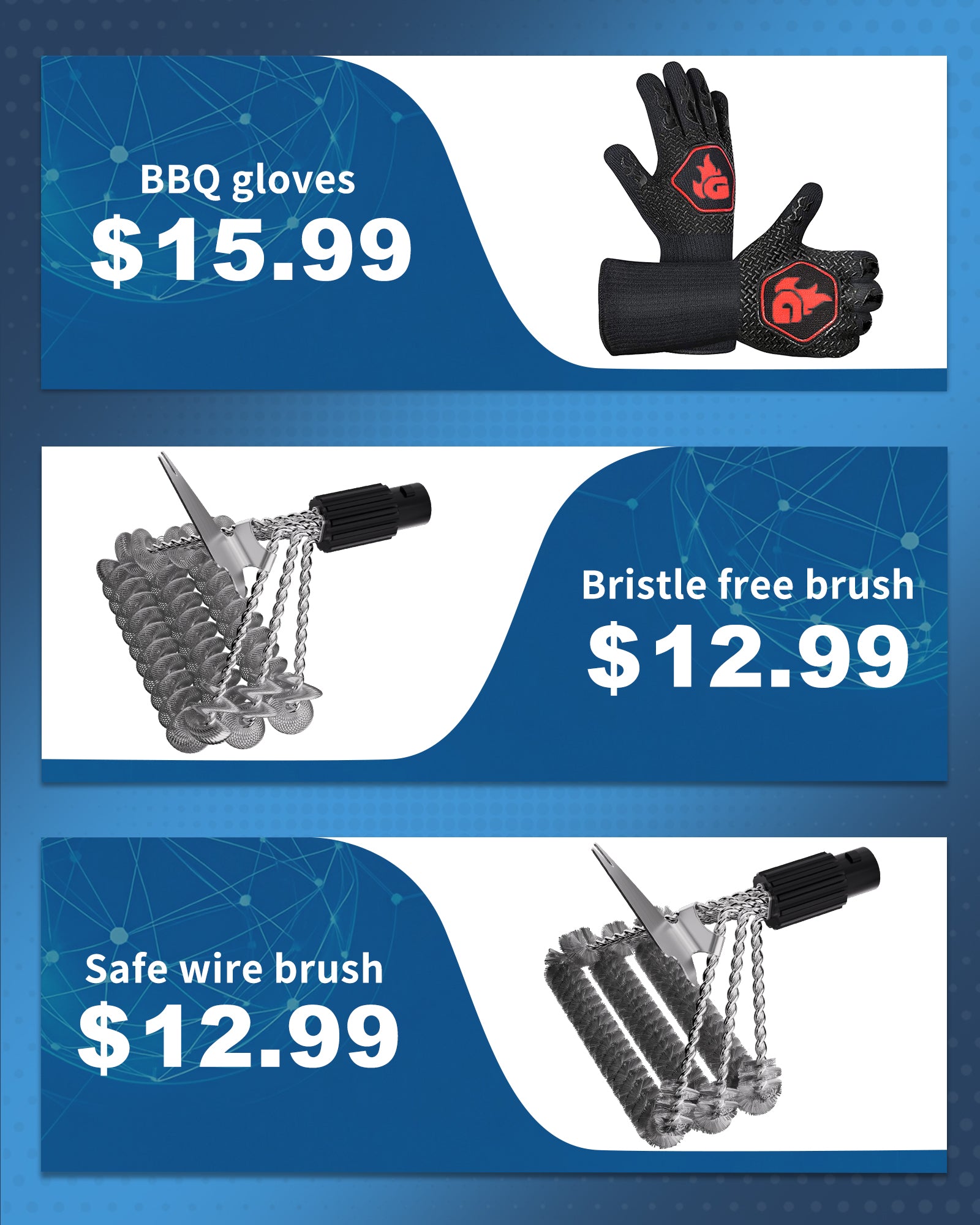 This is the barbecue brush accessories section. You can purchase barbecue gloves, wire brushes, or spring brushes based on your needs